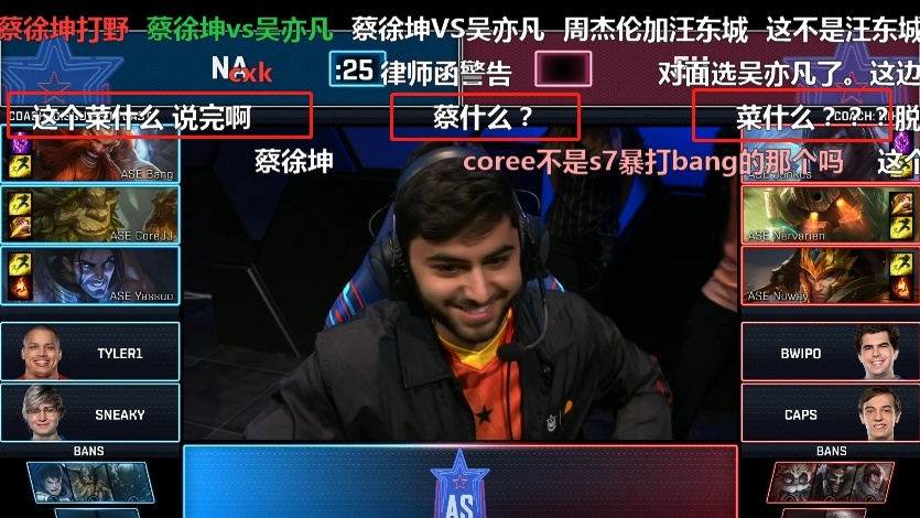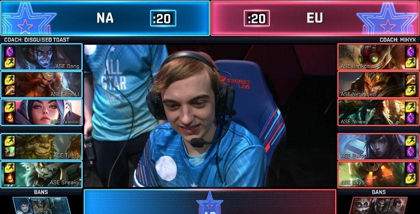 全明星赛毕竟是娱乐第一,NA代表队也选出了一个娱乐性极强的英雄——翠神。这两个英雄在LPL粉丝心目中可有说法了,厄斐琉斯因为没有E技能,被粉丝们称作“无E凡”,而翠神则因为有一个灌篮高手系列皮肤,而被玩家们称为“菜徐坤”。连解说在看到这一幕时差点口误直接说成“菜徐坤”,幸好反应快,改口说成了“种菜的小菊”。
